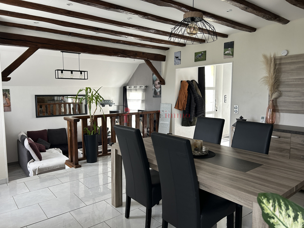 La maison comprend, une entrée, cuisine aménagée, salle à manger avec cheminée insert (répartiteur de chaleur), salon, dégagement, entrée de service, chambre avec bureau sous les combles.