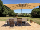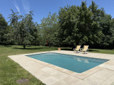 Terrasse, jardin avec abri en bois et piscine chauffée par pompe à chaleur déclenchable à distance.